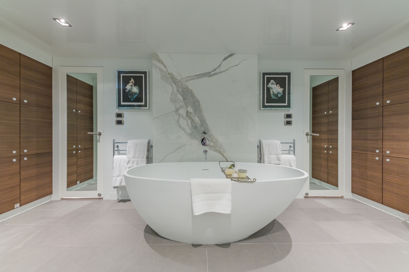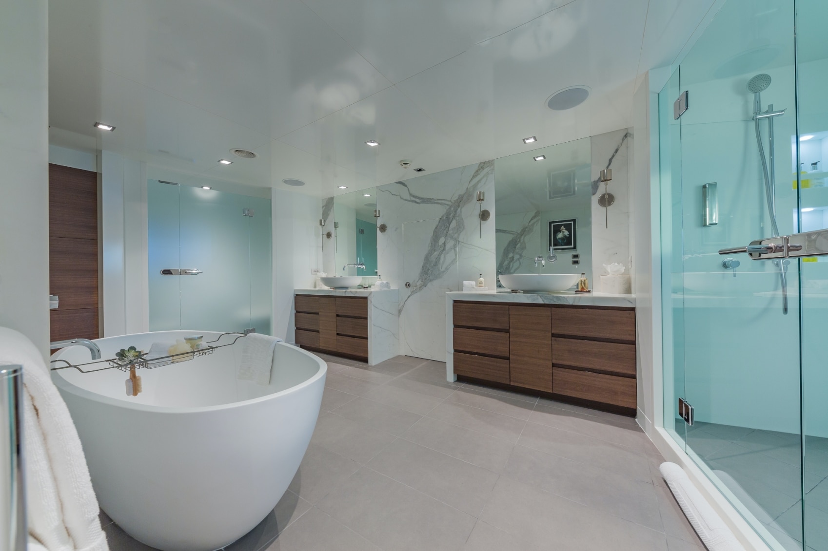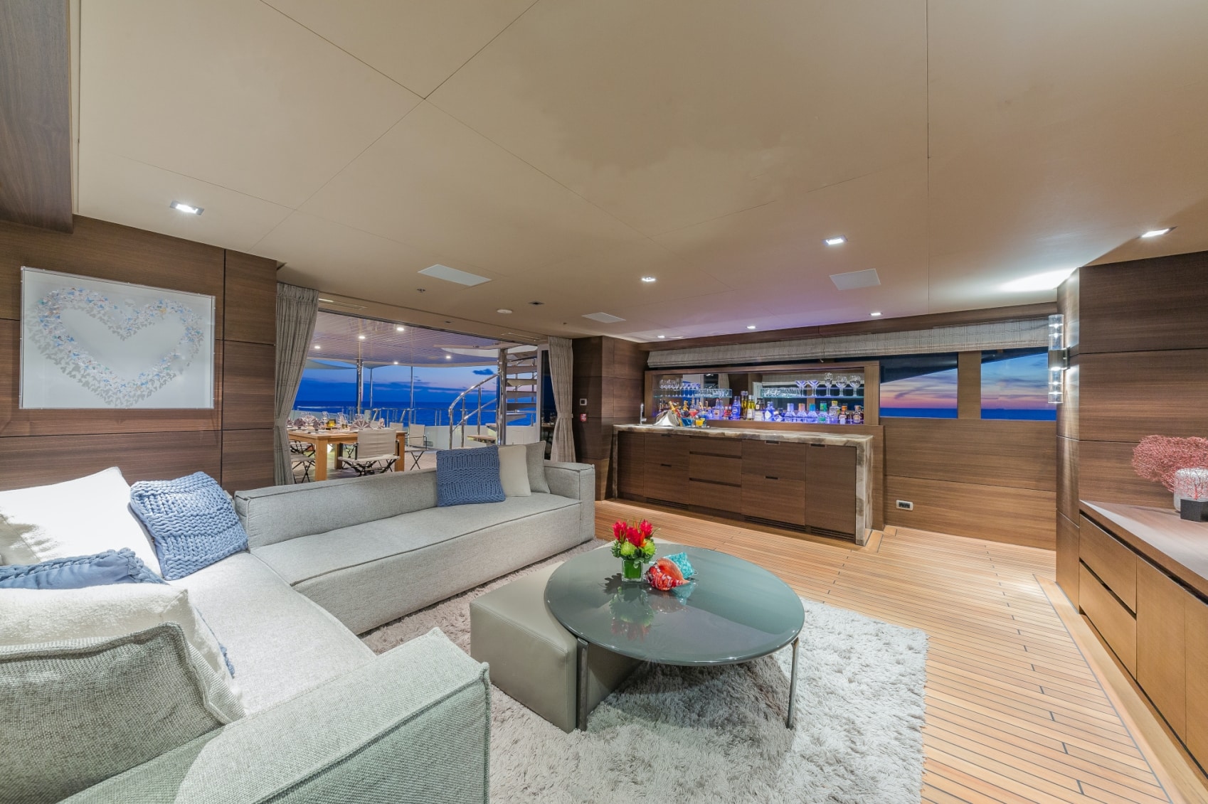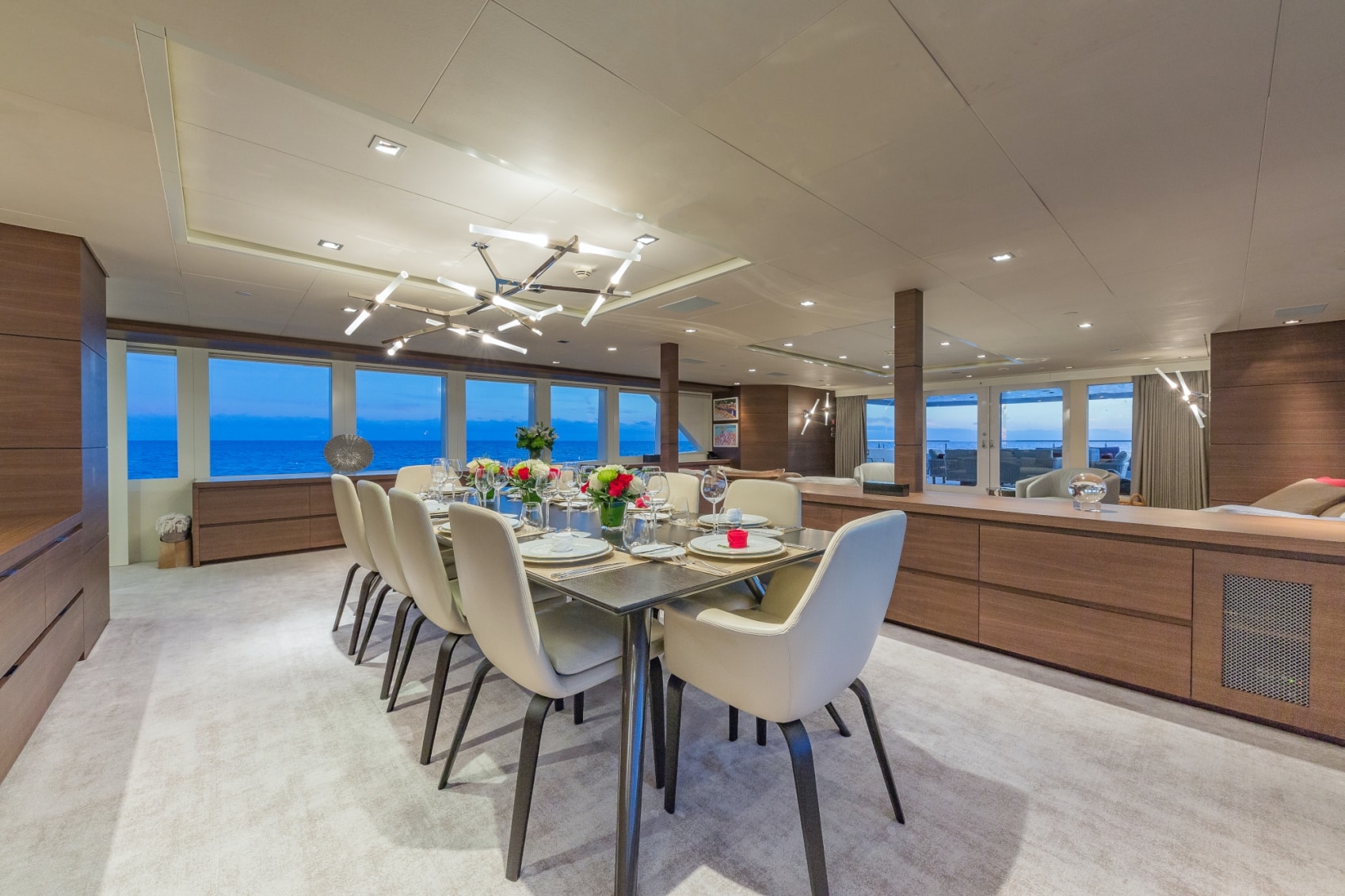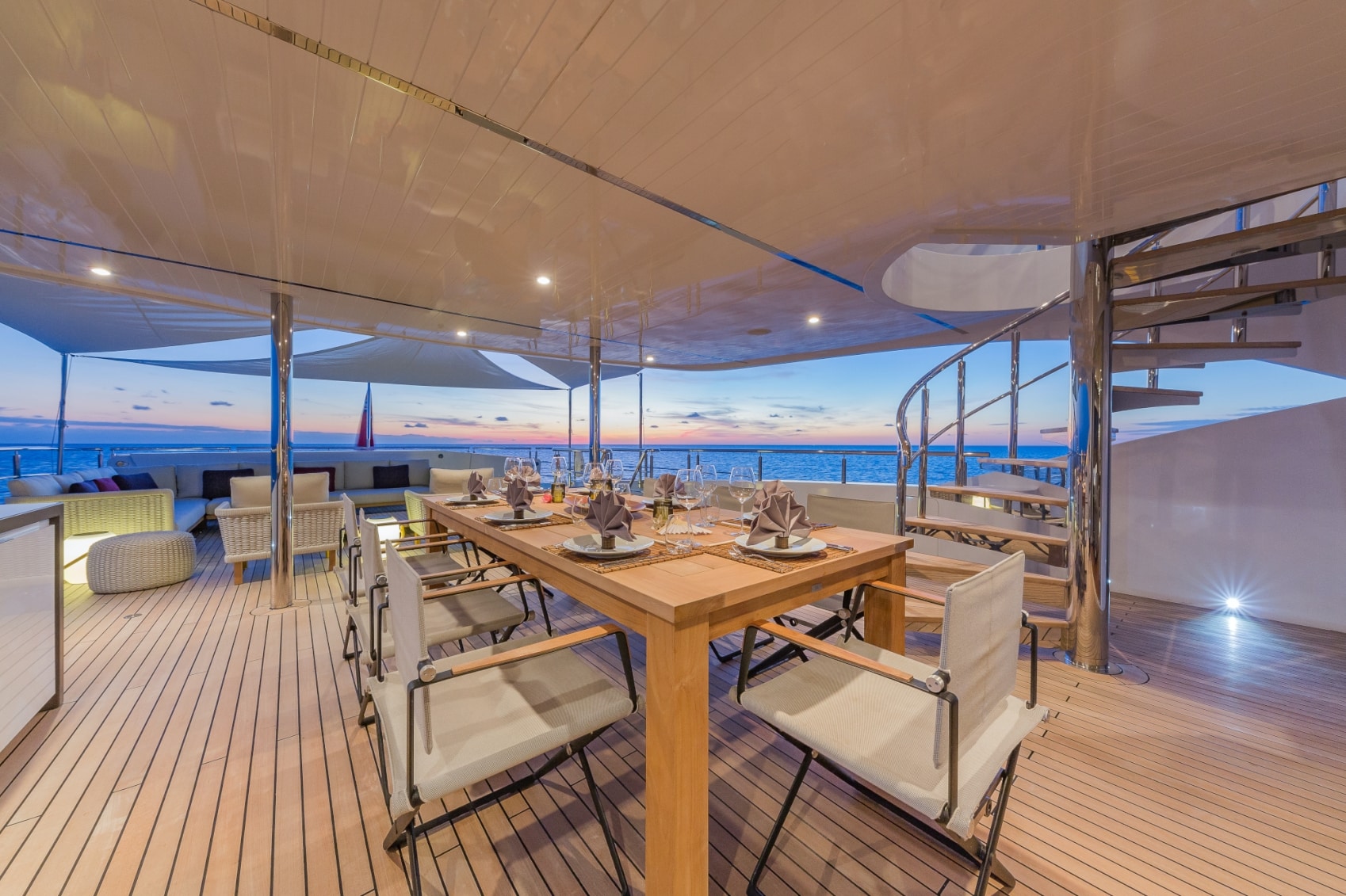 Every inch of Big Sky has been thoughtfully curated to elevate outdoor living. The top deck welcomes guests with a sun-kissed Jacuzzi, a wraparound sunbed bar, and a generous U-shaped lounge, perfect for sipping champagne under open skies. Step down to the sophisticated sky lounge, where an undercover dining area for 11 seamlessly flows into a relaxed lounging space, ideal for post-meal conversations and stargazing. A spiral staircase leads to the main deck’s more intimate lounge setting, while dual staircases at the aft draw guests to a vast swim platform that serves as the gateway to ocean thrills. With four expansive decks dedicated to entertainment and exploration, this yacht defines alfresco perfection.
