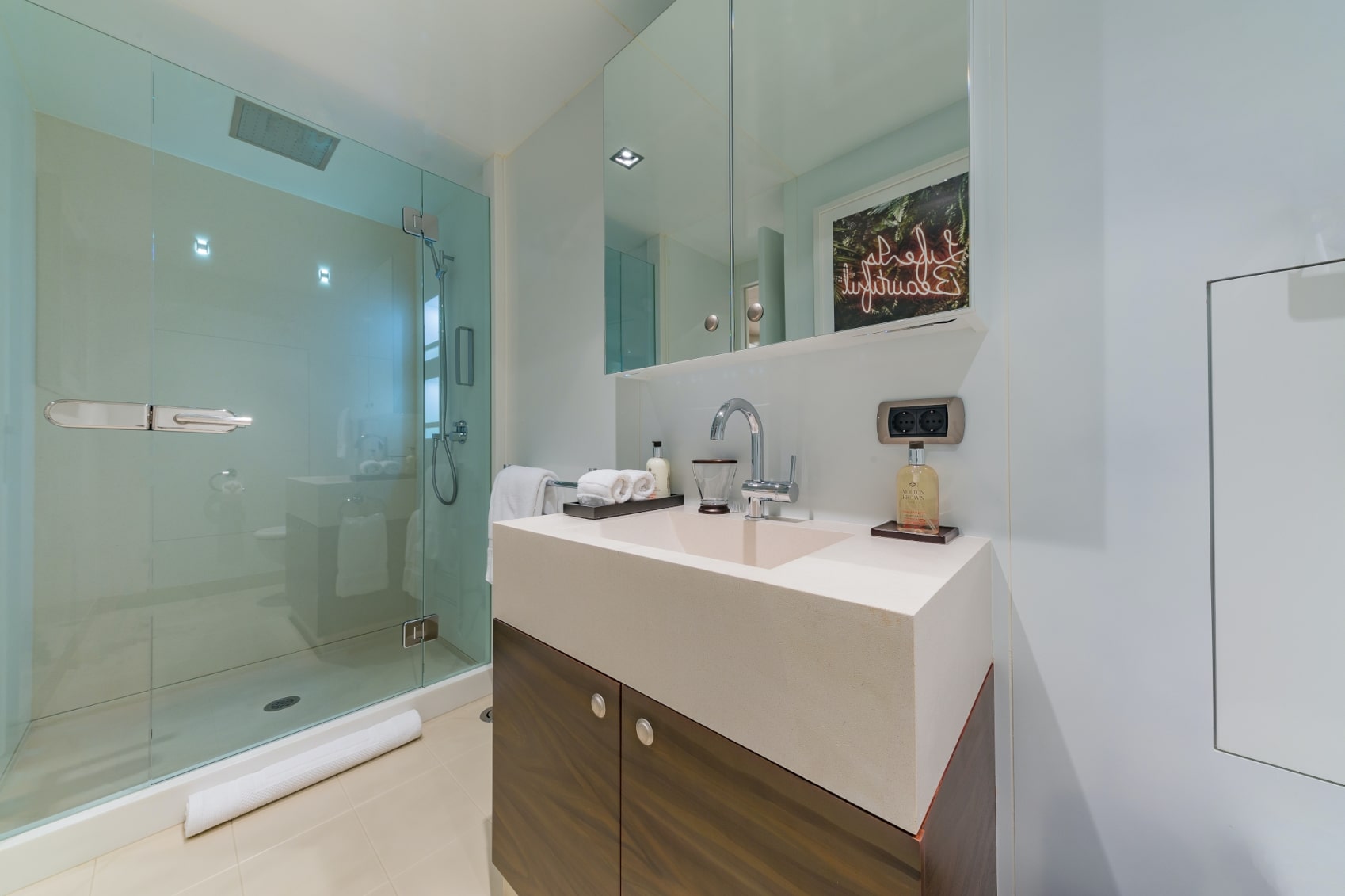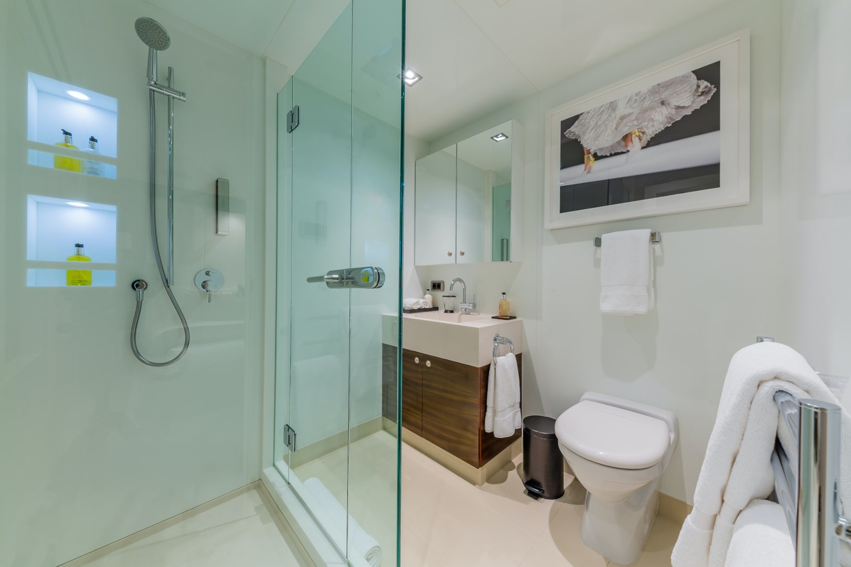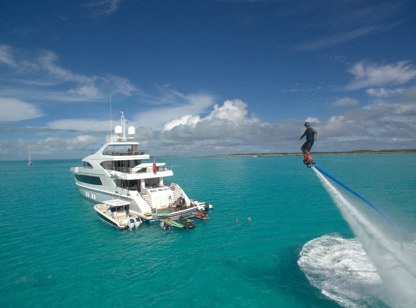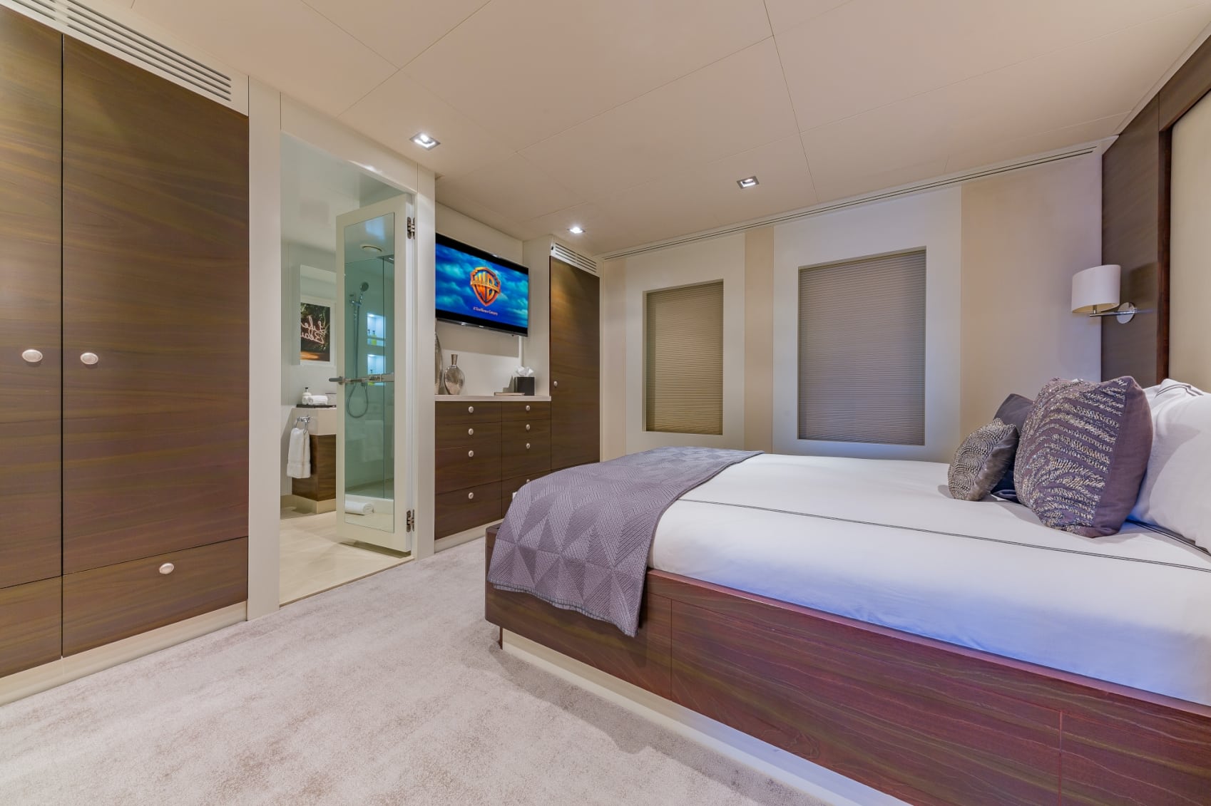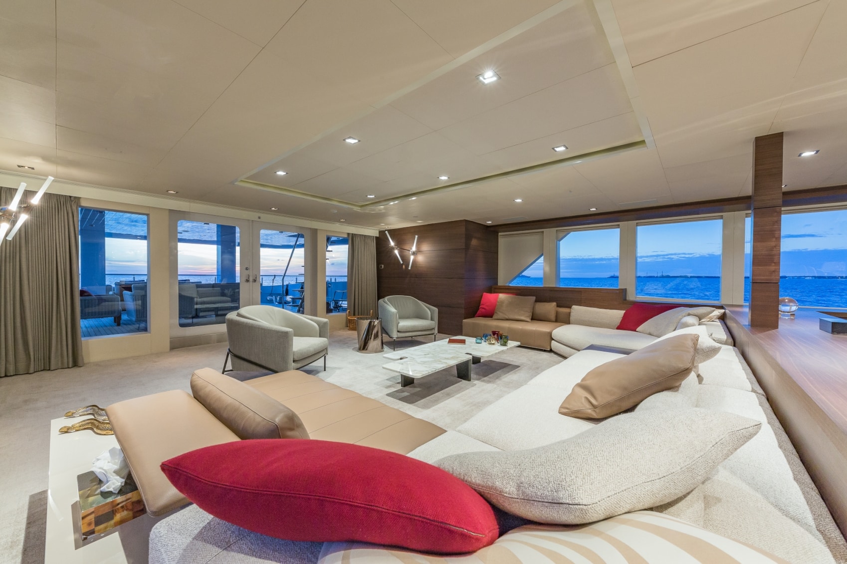 Inside, Big Sky exudes modern sophistication with a calming neutral palette and panoramic windows that flood the saloons with natural light. Each deck features fully stocked bars and plush lounges, blending social elegance with serene escape. The full-beam main saloon stands out as a design centrepiece, open, airy, and irresistibly inviting. With accommodation for 11 guests across five luxurious staterooms, including a stunning main-deck master suite and three queen cabins below, Big Sky ensures restful nights at sea with its advanced zero-speed stabilisers. But it’s not just about relaxation—this yacht boasts one of the most extensive collections of water toys and tenders in the global charter fleet. From seabobs and paddleboards to jet skis and snorkeling gear, every journey becomes a playground for adventure. Families, thrill-seekers, and luxury lovers alike will find Big Sky a floating paradise.
